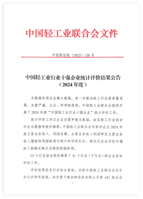 2025年7月9日,中國輕工業(yè)聯(lián)合會發(fā)布《中國輕工業(yè)行業(yè)十強企業(yè)統(tǒng)計評價結(jié)果公告》(中輕聯(lián)信統(tǒng)(2025)136號),發(fā)布了我國輕工業(yè)各行業(yè)的“2024年度中國輕工業(yè)行業(yè)十強企業(yè)”名單。